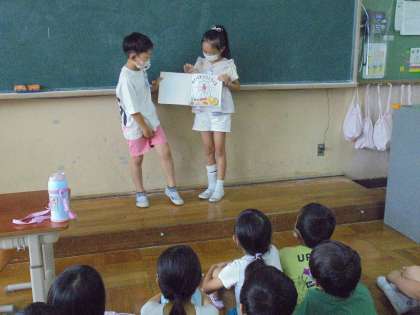 体育係や遊び係,お助け係やお誕生日係など,いろんな係で活動しています。体育係は体育の授業の準備体操のときに,みんなの前で体操をしたり,お誕生日係は先日4,5月のお誕生日のお友だちにおりがみでプレゼントを作ってあげたり,遊び係は体育館の割当の時のみんな遊びを企画したりしています。