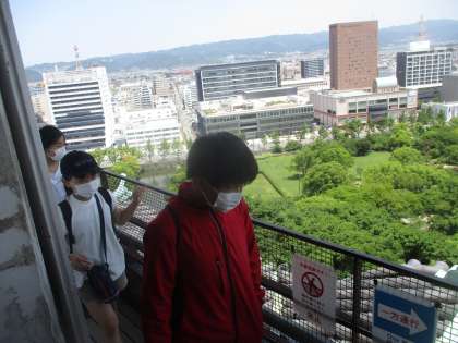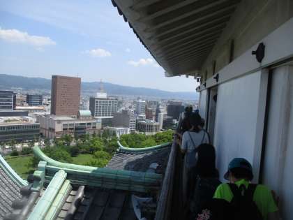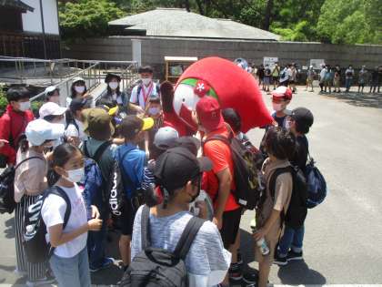 天守閣に着きました。頂上からの眺めはとてもよく,風もとても気持ちよかったです。下りた後は,和歌山城のマスコットキャラクター「梅犬(うめけん)」がお出迎え。子どもたちはうれしそうに集まっていました。次は,お昼ごはんです。