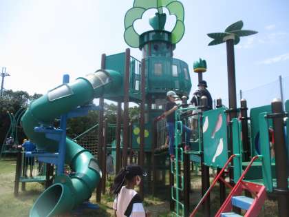 お昼ご飯を食べました。とてものどかでゆっくりとした時間が流れています。ご飯を食べた後,遊具で楽しそうに遊んでいました。次は,「稲村の火の館」です。