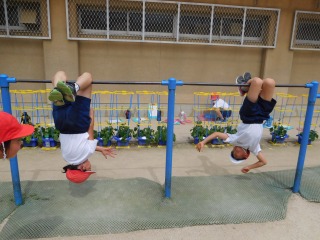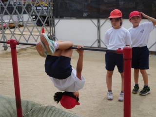 3年生は体育科の学習で「鉄棒運動」をしました。ねらい1では、低学年で身に付けてきた動きをもとに,上がり技や支持回転技,下り技を練習しました。その後のねらい2では、回転技を繰り返したり,上がり技から下り技までを組み合わせたりすることに挑戦しました。2年生の時より、レベルアップすることができた子が多くいました。