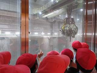 大変大きなクレーンでごみを運ぶ様子を目の当たりにし,子どもたちは興味を持って見学していました。また,ごみを焼却した熱で電気を作っていることに驚いていました。