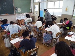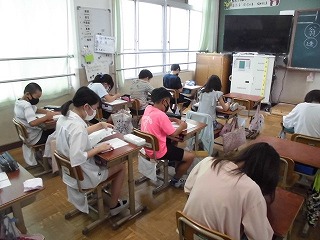 書写で硬筆に取り組みました。「竹取物語」を鉛筆を使って,文字の大きさや配列に気をつけて1行ずつ丁寧に書き写していました。見本を見ながら集中して,真剣に書いている様子がとても素晴らしかったです。