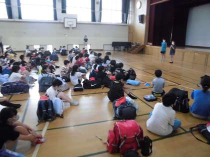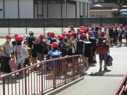 お天気にも恵まれ,4年生が元気にびわ湖青少年の家へ宿泊学習に出発しました。現地ではカヌーやザリガニ釣りなどをする予定です。