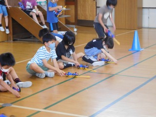 今日は、ゴムの力を使って、どうしたら車を遠くまで進ませることができるか、実験をしました。ゴムの伸ばし方を変えることで、ものの動き方が変わることに子どもたちは気づいていました。また、1本のゴムで、15m以上も車を走らせられることに大変驚いていました。ゴムの本数を増やしてみたいな、太いゴムに変えてみるとどうなるだろう…と、色々やってみたい新しい問いもたくさん見つかりました。