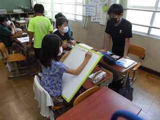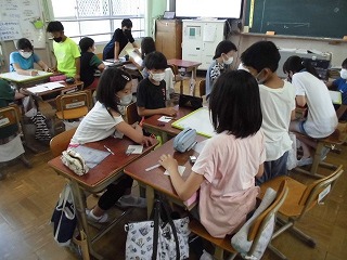 算数科では「合同な図形」の学習をしています。今日は、合同な三角形をかくための3つの頂点の決め方についてグループで考えました。「ここを分度器で角度測ったらいい。」「コンパスを使って、交わったところを頂点にしたらいい。」など、グループで話し合うことができました。今日考えたかき方で、次は実際に作図をしていきます。