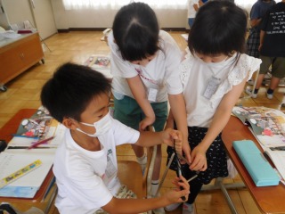 また、「太鼓といった他の楽器も同じだと思う。試してみたい。」「声が出ているときは、のどが震えているよ。」と身近にある音と、ものの震えについてさらに考えを深めいてました。