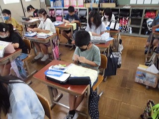 家庭科の裁縫では、玉結び、玉止めを学習しています。自分で何度もやってみたり、友達どうしで教え合ったりしてだんだんとできるようになってきました。