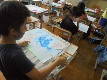 図画工作科の「ふしぎなたまご」の学習で,たまごからどんなものが出てきたら楽しいかを,想像を広げて描きました。