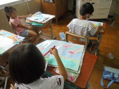 いろんなもようのいろんな形のたまごから,花火や魚や,モンスターなど,いろいろなものが出てくる様子を想像していました。パスや絵の具を使って,想像の世界を楽しみながら描いていました。
