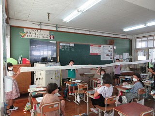 特に、全国的にも有名な「祇園祭」についてその歴史の深さを資料から読み取り、今も昔も変わらず続けられていることについて、気になったことを出し合いました。また、山鉾巡行が700年間続けられていることにかかわって、700年とはどれくらいの長さなのか1年を1cmであらわした等尺年表でその長さを実感しました。