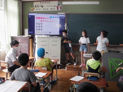 今週2組では、校区に住み、東総合支援学校に通う4年生のお友だちと音楽で交流をしました。最初に学校の紹介や自己紹介をしてもらいました。その後、4年2組の各班で考えた学校紹介クイズをしてから、ボイスアンサンブルや手拍子でリズム遊びをしました。昨年度は、オンラインでの交流でしたが、今回は学校に来てもらって教室で直接交流できたので、互いに楽しい時間をもつことができました。