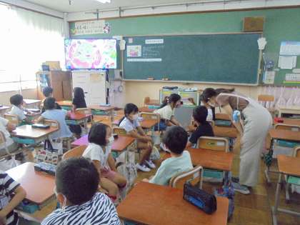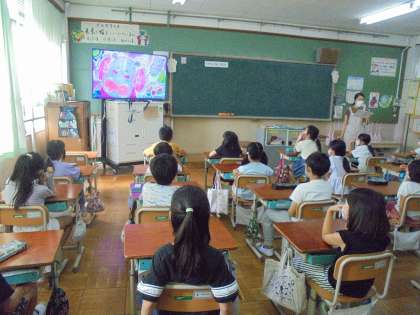 2年生は学活の学習で、栄養教諭の松崎先生に朝ごはんについての授業をしていただきました。