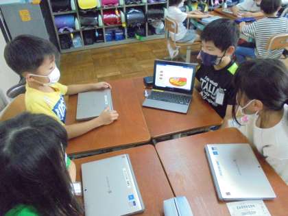 英語活動で、「サラダで元気」の学習に取り組みました。野菜の言い方に慣れ親しみ、作りたいサラダに必要な野菜を友だちに伝え野菜をもらい、サラダを作りました。今回の学習では、GIGA端末を活用し、欲しい野菜を伝えられたら、友だちに野菜をお皿に入れてもらいました。初めはなかなか英語での野菜の言い方が覚えられず苦戦している人もいましたが、いろいろなゲームを通して少しずつ覚えていくことができました。
