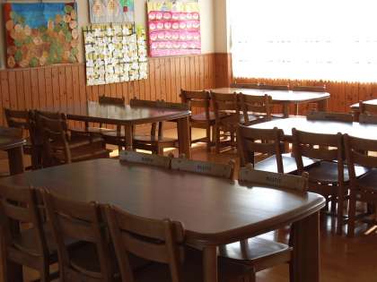 ランチルームの一番の魅力は,きれいなところ。ここで,つきに1回のお誕生日給食も行われます。