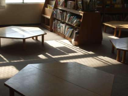 ここではみんなが裸足になってリラックス。第2図書室(本の広場)と合わせ,ここが本校の読書活動の中心。保護者ボランティアの方もここで,意欲的に活動していただいています。