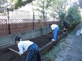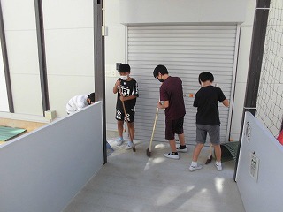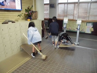 ハナヤ学習では現在、「学校をよりよくするために 〜自分のよさを生かす・人の役に立つ〜」というテーマで、グループごとに会社を立ち上げて活動をしています。給食室までの通路を掃除をする会社や校舎内を掃除する会社、学校の植物を管理する会社の様子です。