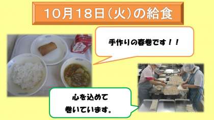 10月18日(火)牛乳・ごはん・カレーあんかけごはん(具)・春巻でした。春巻は、しいたけ・たけのこ・ツナ・はるさめを混ぜ合わせて、料理酒・オイスターソース・塩・しょうゆで味付けをしたものを、春巻の皮で一つずつ心を込めて560本を巻きました。油でパリッと揚げた春巻は、「給食で春巻が1番好き」や「パリパリしておいしすぎる」「2本食べたい」と子どもにも、教職員にも大好評でした。4人の調理員さんと心を込めて給食を作っています。手作りのおいしさを味わってくれたらと思います。