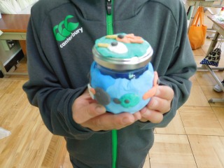 家から持ってきた空き容器に、絵の具で色を付けた粘土を貼り付け、空き容器を変身させていきます。