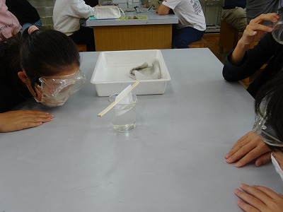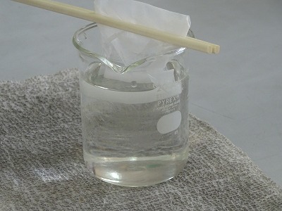 お茶パックに入っているのは、食塩です。水の入ったビーカーにつけると、不思議や不思議、ゆらゆらともやのようなものが。やがて食塩は無くなり、水が「水よう液」に変わったことが分かりました。あのゆらゆらは、「シュリーレン現象」というものです。興味がある人は、ぜひ調べてみてください。