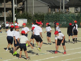 5年生の二つ目の種目、なわとびパフォーマンスでは、曲に合わせて二重とびや交差とび、大縄とびなど様々な技に挑戦しました。練習では、次の技に入るタイミングを合わせることが課題でしたが、自分の次の技は何かということを考えて取り組むことができていたと思います。これまでたくさんの技を練習していましたが、練習の始めはなかなかできなかったことが今日までにとても上手になっている様子が見ることができました。