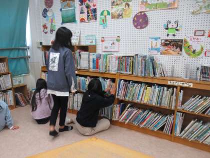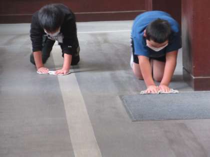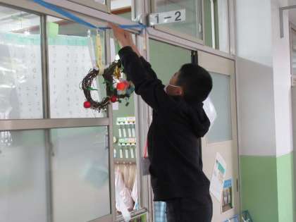 写真は、図書室の本だなをきれいに整えている様子・低学年の教室へ出向いてリースの名札付けや掲示を手伝う様子・かぎ型廊下をピカピカにみがいている様子です。本当にありがとう。がんばる姿がすてきです。