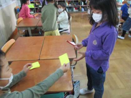 最後には、「トリックオアトリート」の合言葉を言いながらいろいろな班をまわって、いろいろな色のカードを集めました。