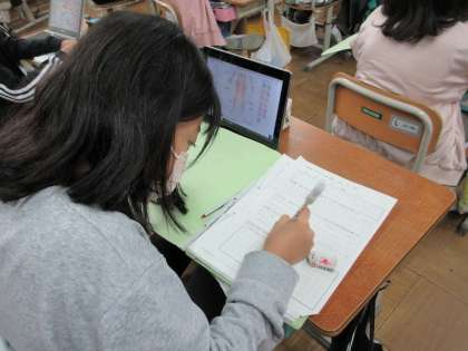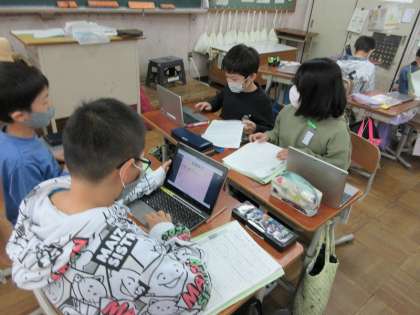 ヒトの体の骨や筋肉の構造について、ロイロノートに配信された資料をもとに一人一人で調べ学習をし、その後班や全体で調べてわかったことを交流しました。