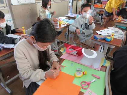今回は飛び出すしかけに挑戦しています。完成が楽しみです。お家に持って帰って帰るのをお楽しみに。