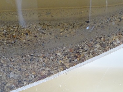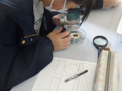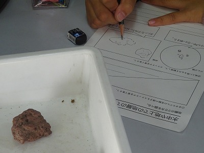 前回の実験でしま模様の中身は判明しましたが、「それならなぜずっとまっすぐな層になるのだろう?」という疑問も出てきました。そこで、水中と地上で層ができうる条件を、モデル実験と観察から考えることにしました。水中のモデル実験では、運動場の砂を装置に流し入れると順に積もって層ができました。地上に層ができる、つまり上空から降ってくるものの観察では、火山灰や溶岩にキラキラ光るものが含まれていたり、角ばった形をしていたりすることが分かりました。長い年月をかけて、これらの現象が層を作り出しているようです。