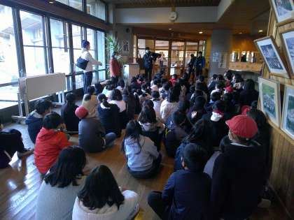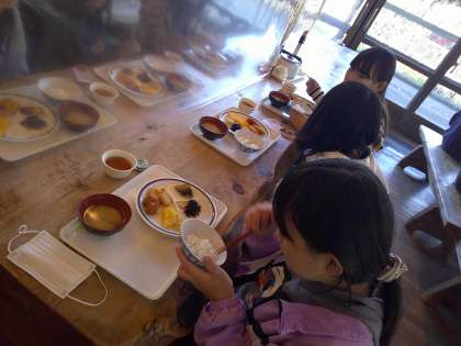 食堂前で次の活動の説明をしっかりと聞き,朝食です。パンかごはん,お味噌汁かスープを選びます。今朝も「お替り6回した!!」などという声が飛び交います。しっかり寝て,しっかり食べて,今日も充実した一日になりそうです。