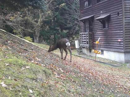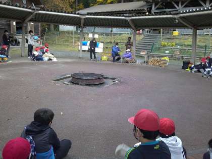 少し小雨がちらつきましたが,元気に野外炊事場へ出発です。途中,鹿が見送ってくれました。火の種の作り方を教わります。