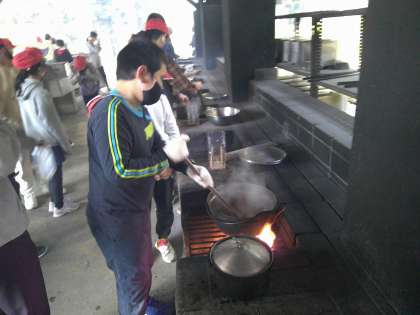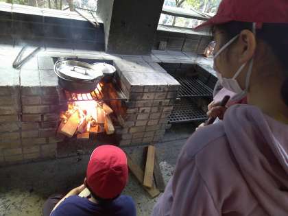 自分たちで起こした火の種を大事に,カレー作りです。薪係,ごはん係など,係に分かれて,助け合い,一生懸命です。