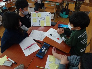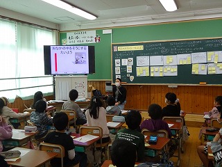 国語では「すがたをかえる大豆」について学習をしていますが、大豆についてもっと詳しく知るために栄養教諭の先生から大豆の魅力について教えてもらいました。大豆は「畑の肉」と呼ばれるほど、栄養もたくさんある食品です。子どもたちは国語で学んだことや併行読書で知ったこと、事前に視聴した大豆の秘密の動画で知ったことなどと関連付けて、さらに大豆について深く考えることができました。
