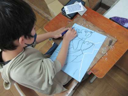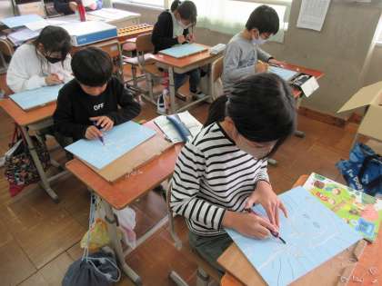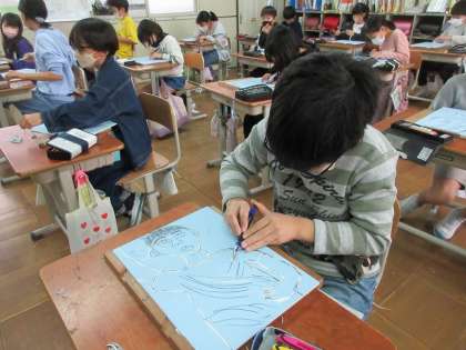 初めて彫刻刀を使う児童も多く、怪我をすることのないように気を付けて板に写した下絵を彫り進めています。曲がった線や細かい部分を彫ることに特に難しさを感じながら頑張っています。