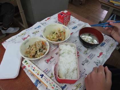 でき上がったご飯とみそ汁は、今日の給食のおかずと一緒にいただきました。「ご飯がおいしく炊けた。」「みそ汁の味が少しうすかったかな…。」「大根がたっぷりでおいしい。」など感想もいろいろでした。