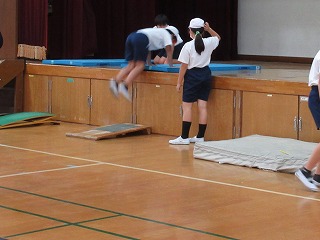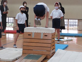 とび箱運動の学習では動くだけでなく、友達のやっているところを見ること、友達にアドバイスを出すことを大切にして学習しています。かかえこみ跳びをやっている友達に対して「足をむねに近づけるようにしたらいい。」と具体的なアドバイスを出したり、台上前転をやっている友達に対して「今のところよりもっと頭の後ろをつけるようにしたらいい。」というようにアドバイスを出したりすることができました。