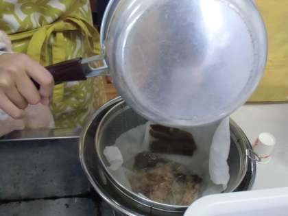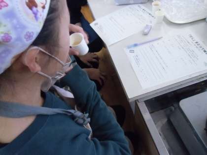 だしの役割を見つけるために、だし(かつおと昆布)とお湯それぞれに塩としょうゆで、味をつけて飲み比べました。だしがある方が「香りがよい」や「風味がある」「味が濃く感じる」など、だしのよさや役割をそれぞれ気付いているようすでした。同じ味付けをしているのに、味の濃さに違いを感じるのは、「うまみ」が関係していることを学びました。薄味でおいしく仕上げるためにも、日本のすばらしい「だしの文化」を大切にしてほしいなと思います。