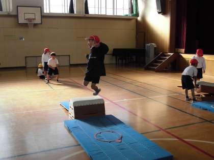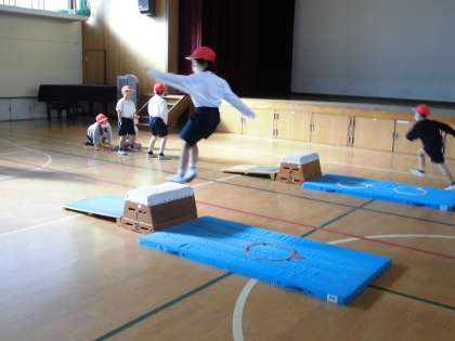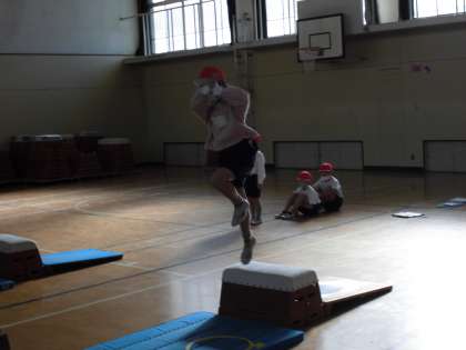 体育科で「とびばこあそび」の学習をしました。「ドン!」と両足で踏み切り「パン!」と手をついて跳び乗ったり、片足で踏み切り大きくジャンプをしたりしました。写真はレインボージャンプあそび(踏み越し跳び)の様子です。しっかり跳べるようになったら、体をひねったり、高く跳んで着地するまでにパチパチ拍手をしたりと、レベルアップ技に挑戦していました。