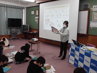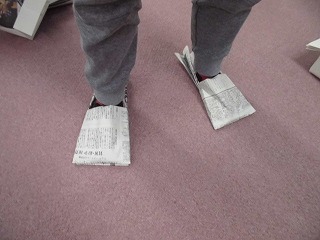 次に、災害で避難生活をしないといけなくなった時に便利な身の回りのものでできる避難生活グッズの作り方について学習しました。まず、地震などで食器が使えなくなった時に何をどのようにして食器の代わりにするかについてワークシートを使って考えました。「アルミホイルを食器の形にする。」「新聞紙で食器の形にして、ラップで覆う。」など食器の代わりになるものについて考えることができました。また、ペットボトルをハサミで縦に切る方法もあることを知りました。最後に新聞紙を使ったスリッパ、紙を使った食器の形を実際に作りました。今日の学習から自分たちにできる防災などについてこれから考えていきます。
