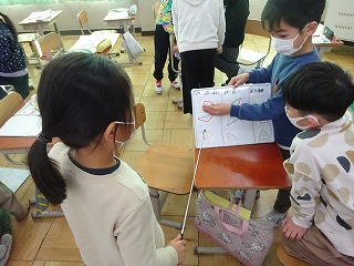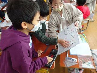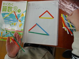 3年生の冬休み明けの最初の算数の学習は三角形です。はじめの時間は色ぼうを使って、いろいろな三角形を作り、辺の長さに注目して仲間分けをして、どのような理由で仲間分けをしたのかを話し合いました。