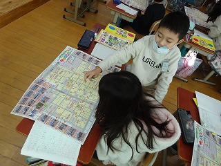 社会では来週京都府警察広報センターに社会見学に行く予定です。見学に向けて、校区の安全マップを見て、どのような危険が身の回りに潜んでいるのかを調べ、話し合いました。