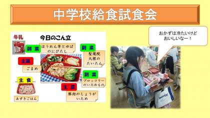 詰め替えをする中で、「カップが動いておかずをつめるのが難しい。お弁当箱に入り切らない。野菜が多い。」などいろいろなつぶやきがみられました。食べた後の感想では、「とても美味しかったです。野菜が多めでもいいなと思いました。お弁当を作るときの参考にしたいです。」や「中学校の給食は、美味しかったです。また、ほかの給食も食べたいと思いました。」「量が多かったです。」「苦手なものがありました。」などがありました。