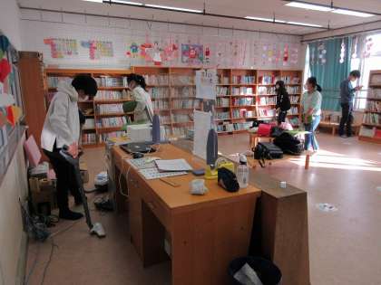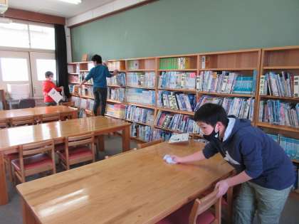 今日、図書委員会では2つの図書室や本が飾ってあるかなえるロードの清掃活動を行いました。