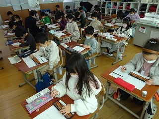 最後はフラッシュ暗算に挑戦しました。数秒間でいくつもの数字が出てきて、子どもたちは必死に計算している姿が印象的でした。2時間の授業を通して、そろばんを使うとこれまで暗算や筆算でしてきた計算ができることに気づくことができました。