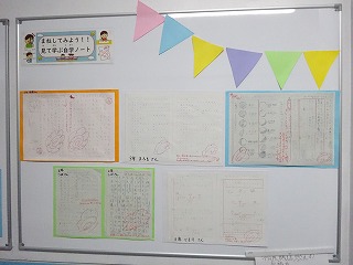 七条第三小学校では全校で自学自習の取組を進めています。学年ごとに目標をもって毎週末に取り組み、取り組んだもので特に頑張りが見られたノートを教室前の廊下に掲示しています。