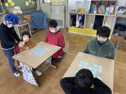 今日の国語科の学習は五色百人一首に取り組みました。さくら学級では1学期から数回取り組んできましたが、今では上の句は読まれた時点で札をとる児童も出てきました。段々と札をとるスピードが上がっています。