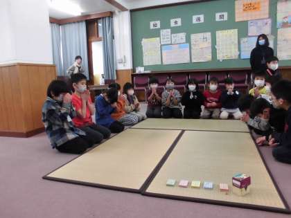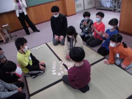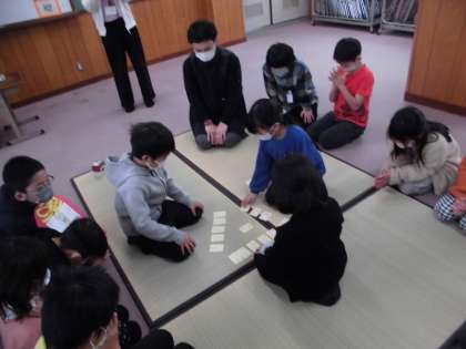3日(金)に、百人一首の決勝戦を行いました。2年生からは学年代表決定戦で優勝した1組が代表として決勝戦に参加しました。決勝戦ということもあり、とても緊張した様子でしたが、練習の成果を発揮し頑張っていました。結果は2位でした。緊張して取れなかったり、負けたことが悔しかったと涙を流していたりする児童もいました。