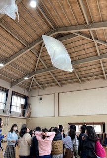 体育館でミニ熱気球を飛ばしてみました。