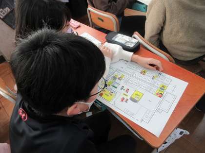 実際の七条第三小学校の校内図でこまを動かしながら、“Go straight.”“Turn right/left.”の表現をうまく使ってやり取りしていました。