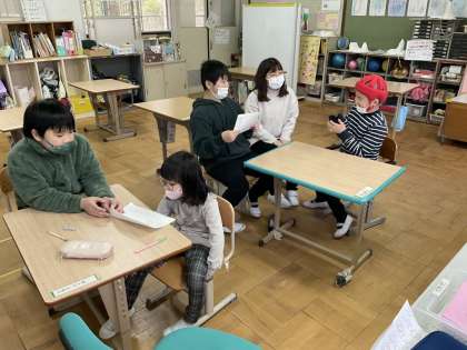 授業の後半は、はじめの言葉と終わりの言葉の練習です。6年生が内容を考え、2・4年生が読みを担当しました。6年生のアドバイスを受けながら2・4年生が一生懸命練習しました。どちらの係も輝いています。